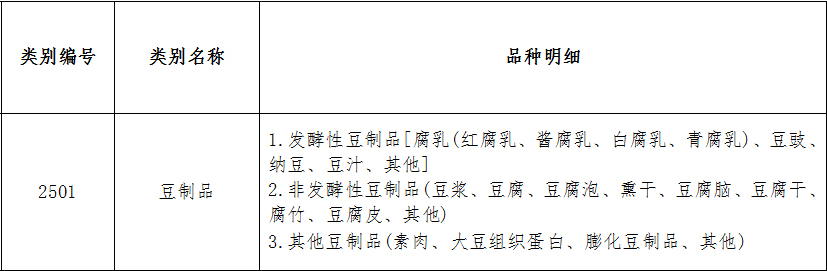 豆制品類別編號及類別名稱:2501豆制品