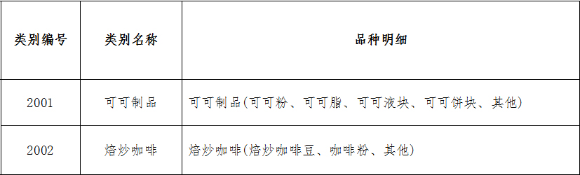 可可及焙烤咖啡產(chǎn)品類別編號及類別名稱:2001可可制品;2002焙炒咖啡
