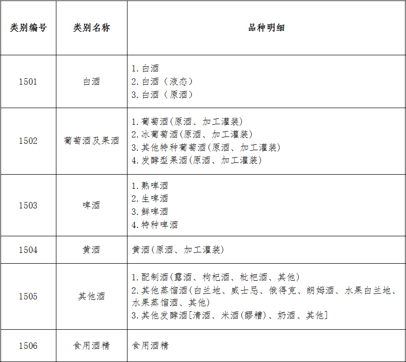 酒類產品類別編號及類別名稱:1501白酒1502葡萄酒及果酒;1503啤酒1504黃酒;1505其他酒1506食用酒精