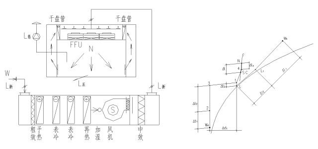 為了節(jié)能、消除空氣熱濕處理過程中的冷熱相互抵消,在潔凈室凈化送風(fēng)量大于消除余熱、余濕的空調(diào)送風(fēng)量時(shí),最好采用一、二次回風(fēng)方案,將二次混合點(diǎn)設(shè)計(jì)在系統(tǒng)送風(fēng)點(diǎn)上,該方是最節(jié)能、最經(jīng)濟(jì)的送風(fēng)方案。其原理圖和焓濕圖如下: