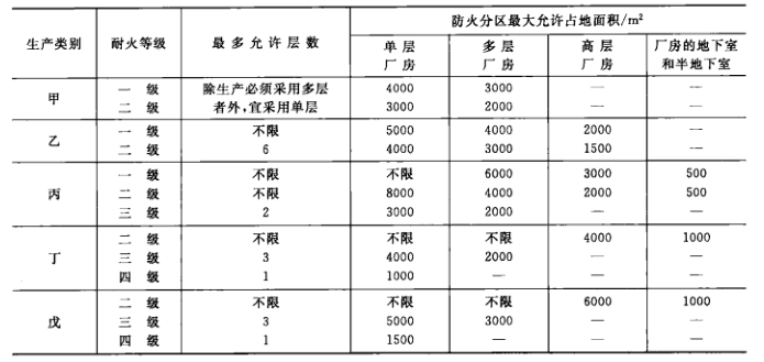 生產安全防火不但對各類廠房的耐火等級給出要求,而且對廠房的層數和占地面積有所限制,并且應符合1的要求(建筑設計防火規范另有規定者除外)。