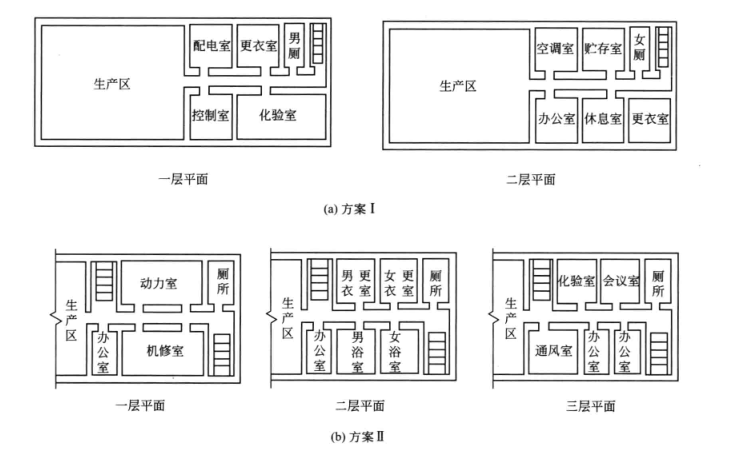 一般地,生產規模較小的車間,可將非生產區布置在車間的一個區域內,即采用集中式布置形式。由于生產區用房的高度一般較高,而非生產區用房的高度往往較低,如3m3.3m3.6m等,因此,生產區常采用單層,而非生產區則可采用多層。