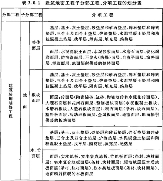 3.0.1 建筑地面工程子分部工程、分項(xiàng)工程的劃分應(yīng)按表3.0.1的規(guī)定執(zhí)行。