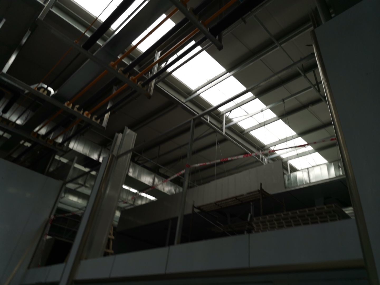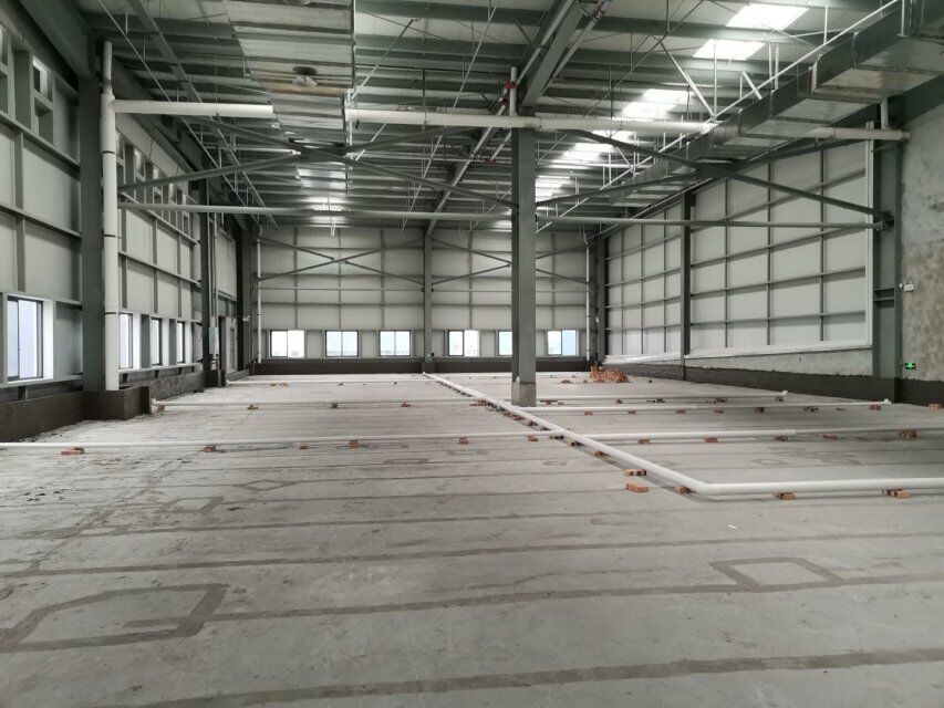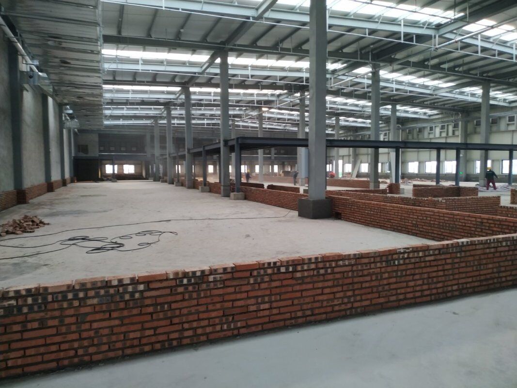 車間施工現場,鋼筋預制捆扎完成,擋水墻抹灰施工,排水溝貼磚完。