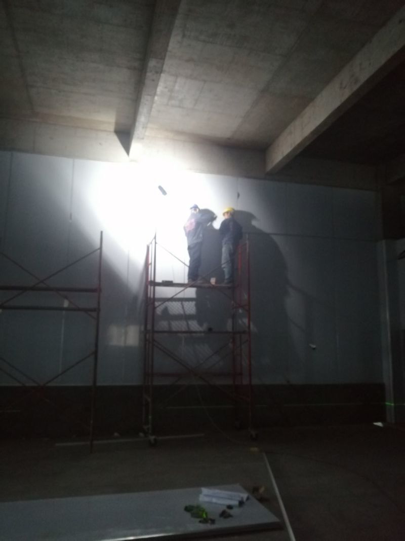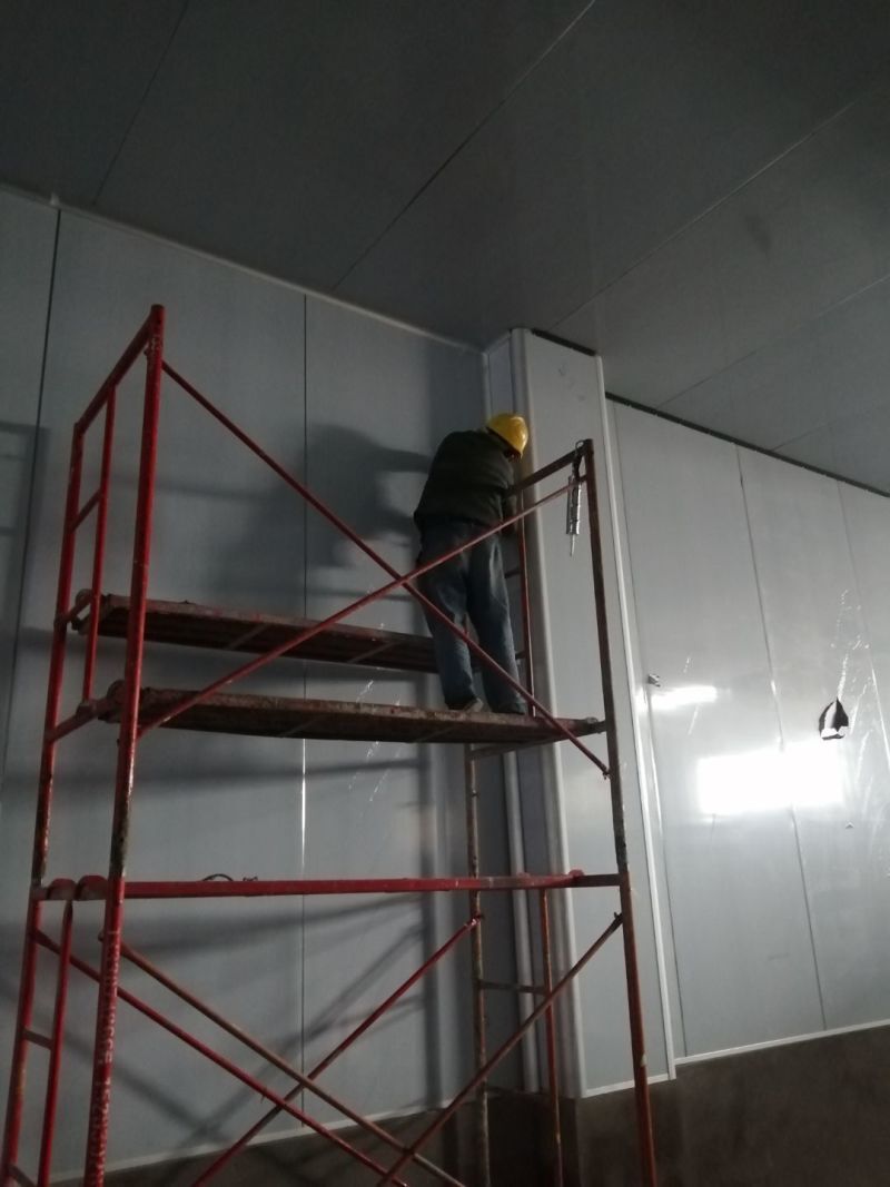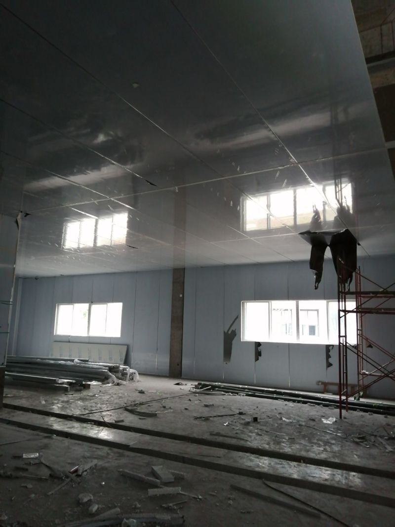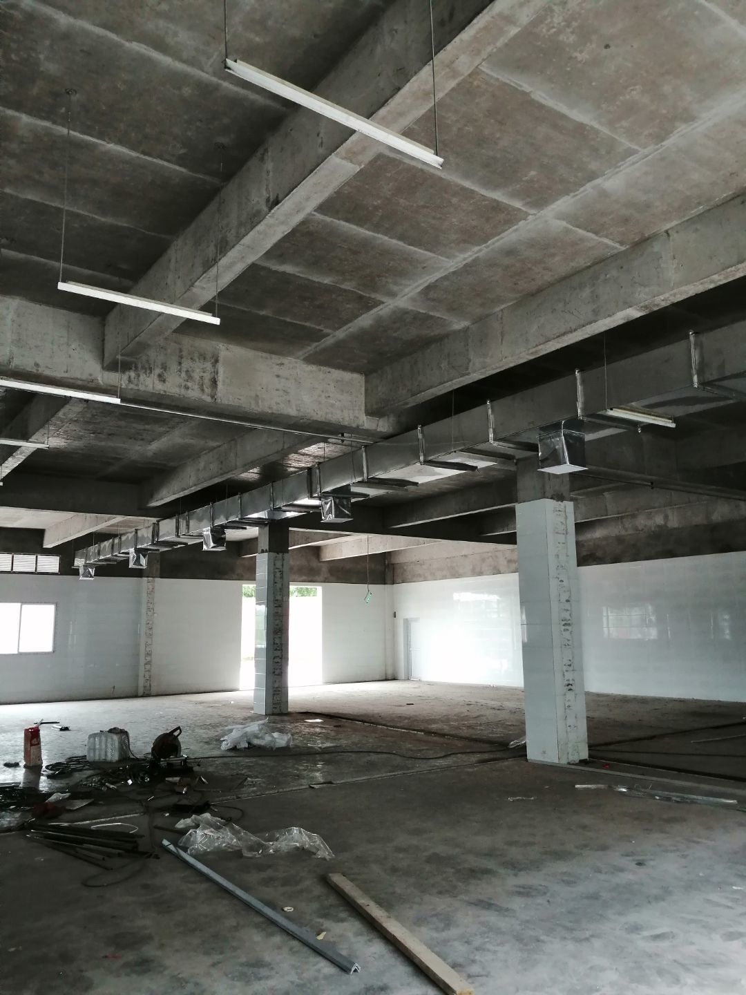 1.風管組裝完成,保溫完成百分之五十 2.彩鋼板開始全面吊頂