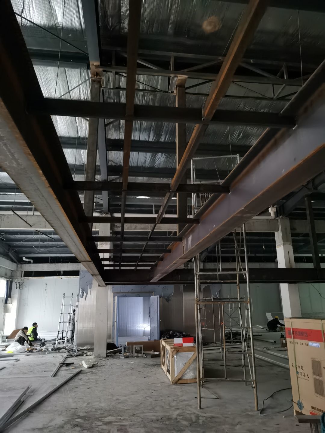 1、鋼接構完成70%;2、凍庫完成100%;3、彩鋼板開始立墻板