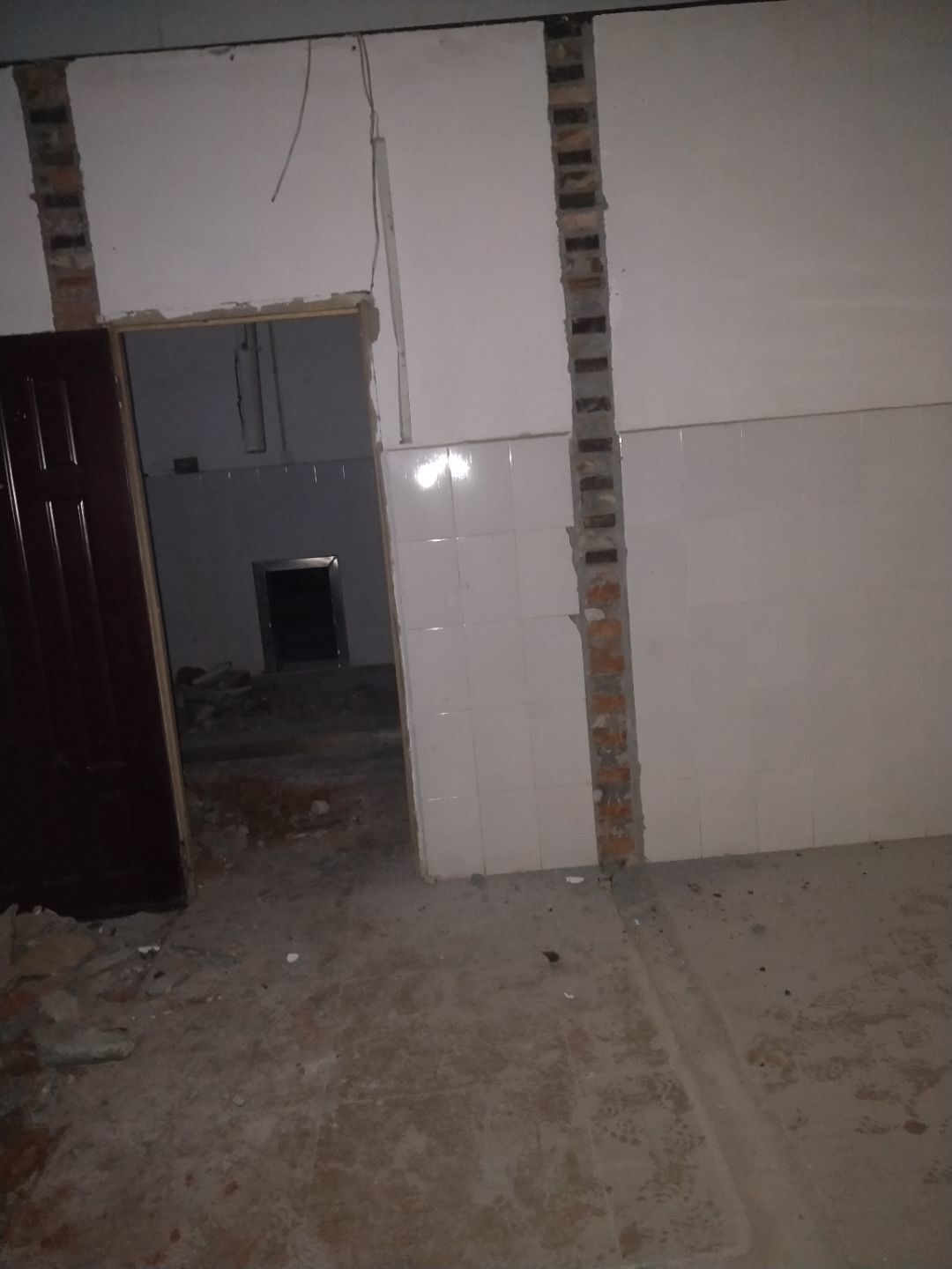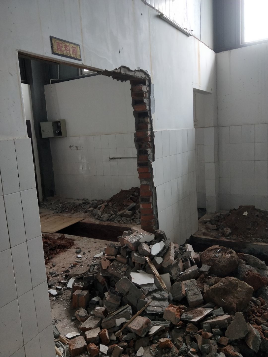 板材到場下貨,掛鋼繩,門洞貼磚修補,排水點貼磚