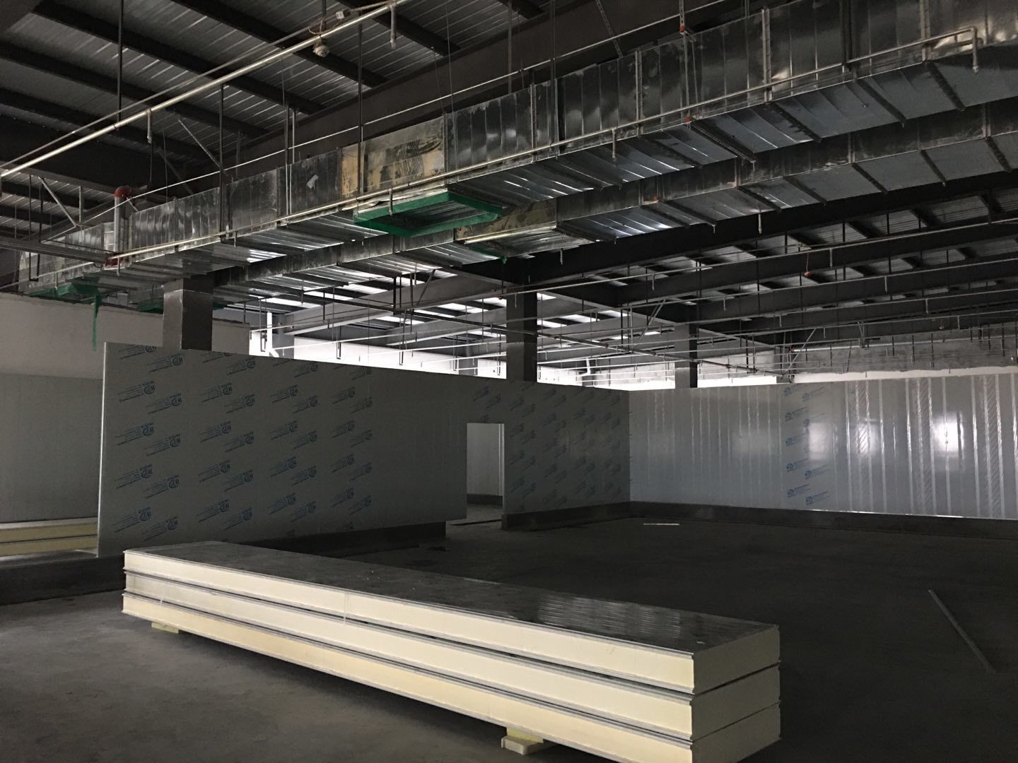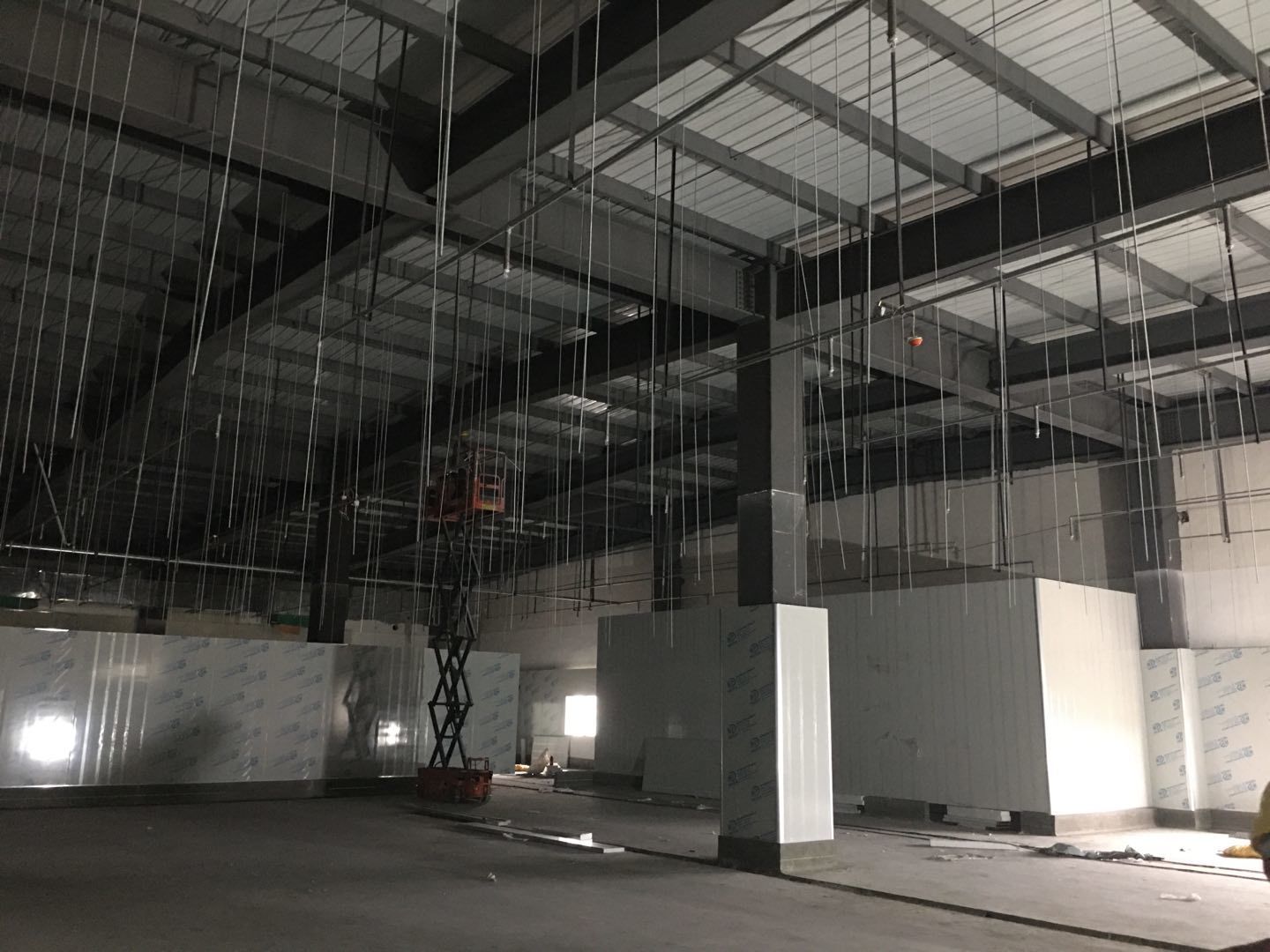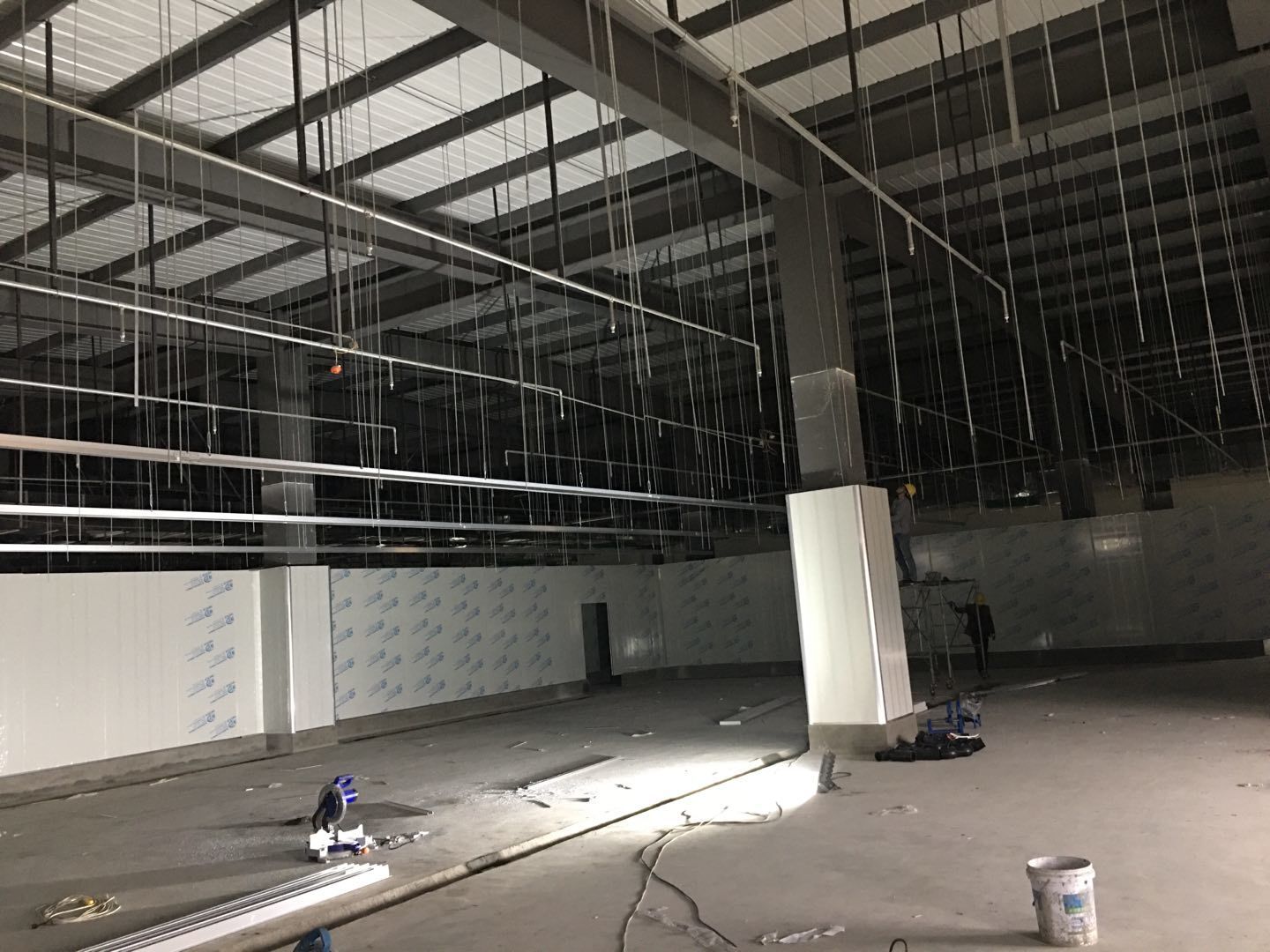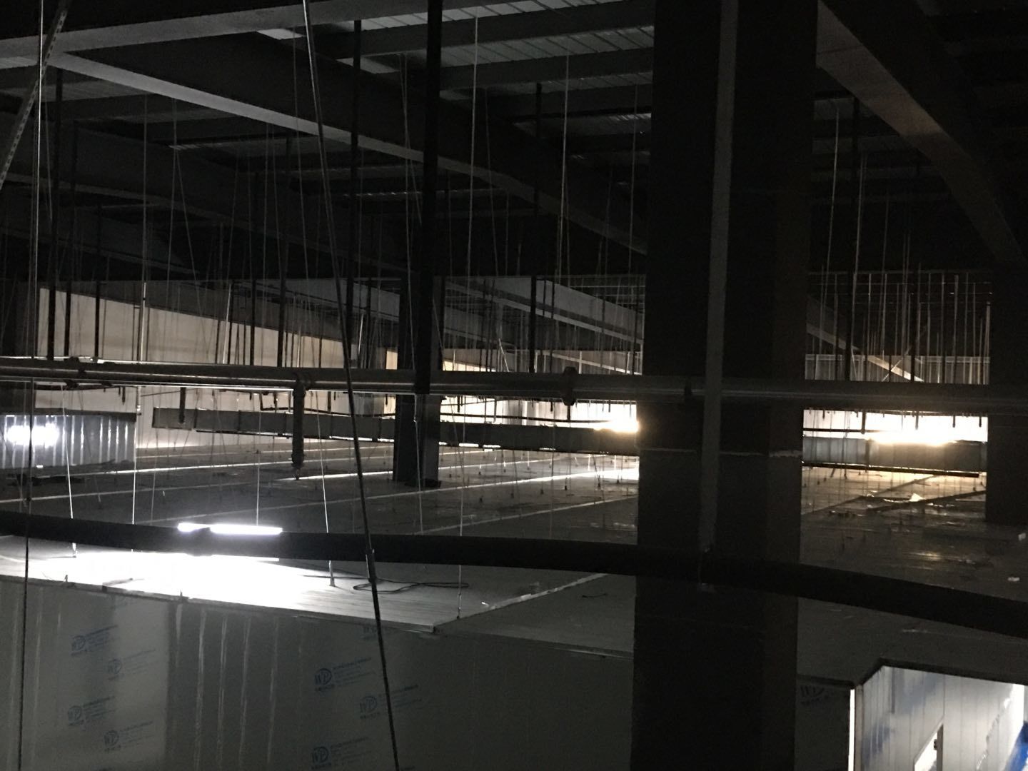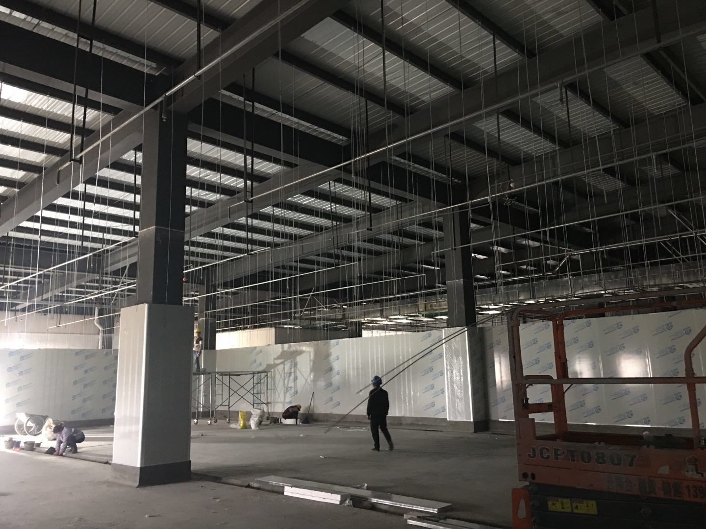 1.簽證彩板內(nèi)包材庫未封頂,門窗已投合,明日開始全面開預(yù)留孔2.空調(diào)班組、風(fēng)盤絲桿支架固定,管道布置焊接。3.水電班組-燈具安裝,配線配管。全部燈具安裝完成。
