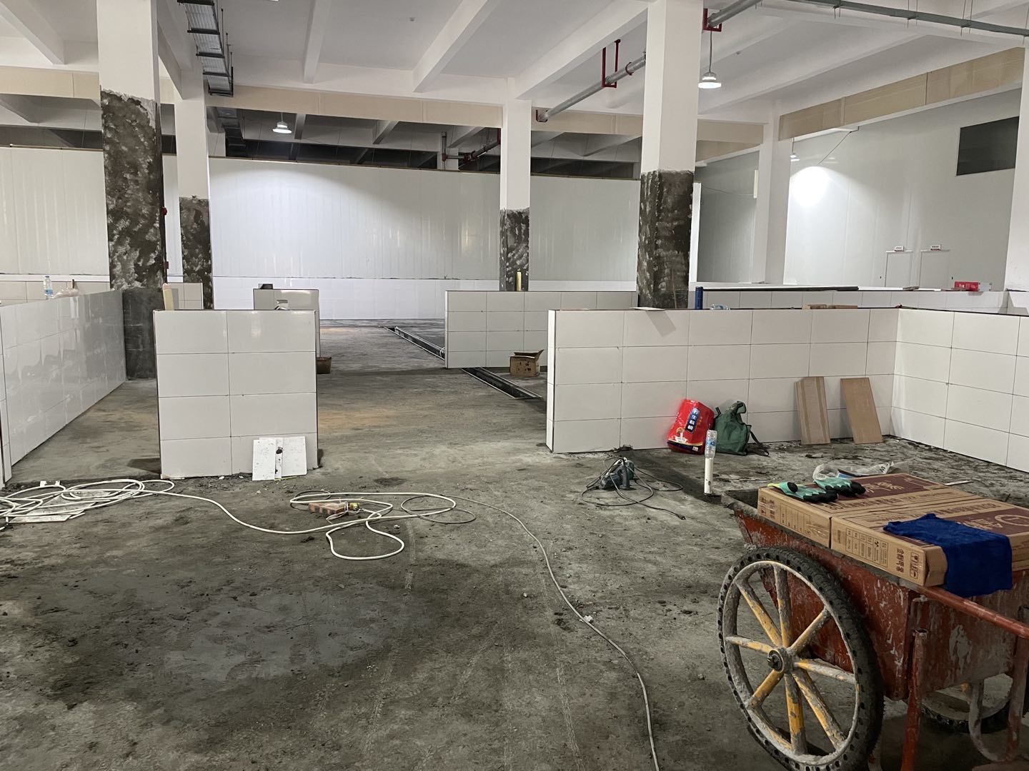四川鮮美滋食品有限公司廠房裝修現場:1、擋水墻抹灰完成百分之30。 2、水磨石地面抓毛完成百分之35。