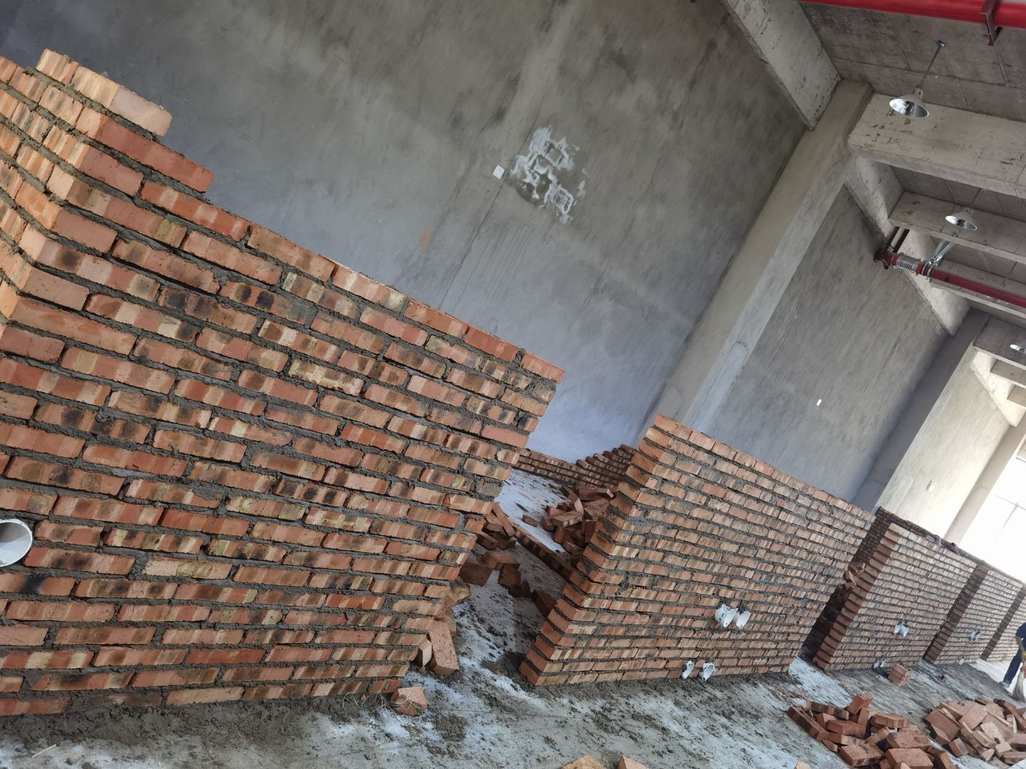 1三層磚墻砌筑 2二層磚墻貼磚 3一層破碎地面 4二三樓鋼管焊接 加固