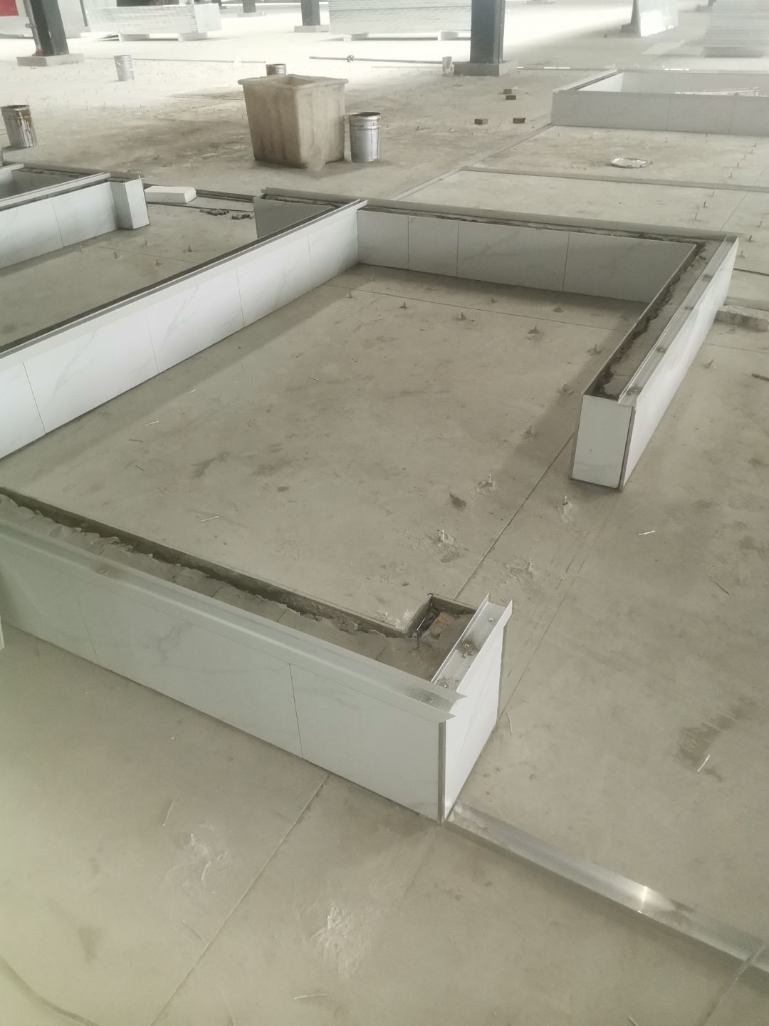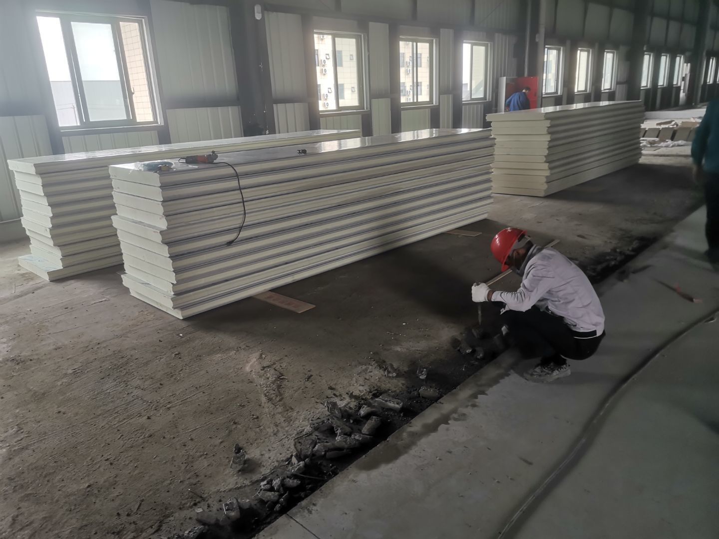 1、擋水墻貼磚完成90%(剩余待凍庫安裝完成后實施); 2、凍庫庫板安裝完成100%; 3、地坪修補注漿鉆孔完成100%; 4、注漿加固完成100%; 5、彩鋼板安裝完成75%; 6、地槽安裝完成100%; 7、排水孔開洞完成100%。