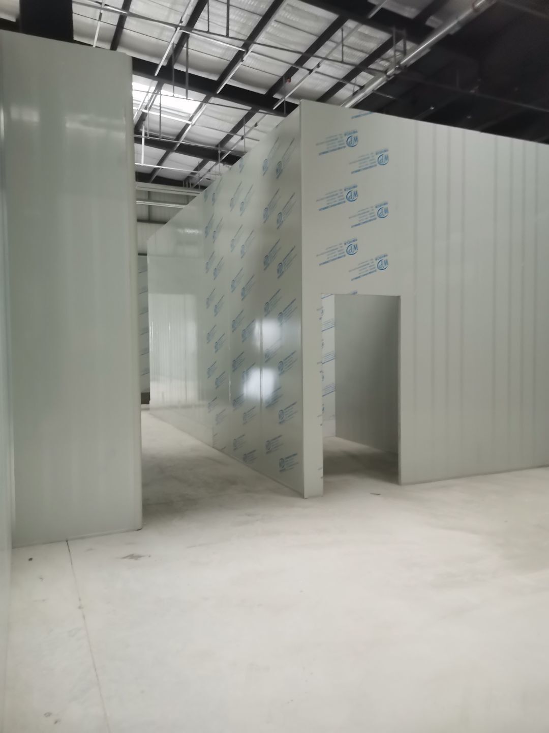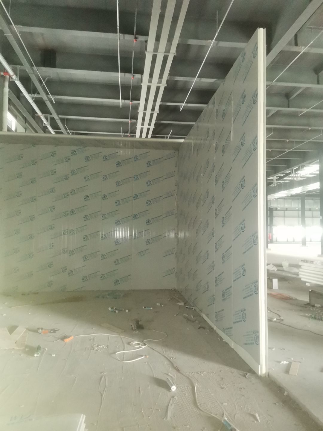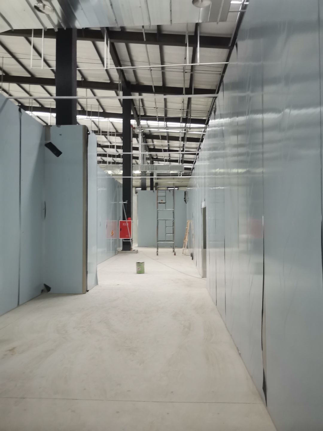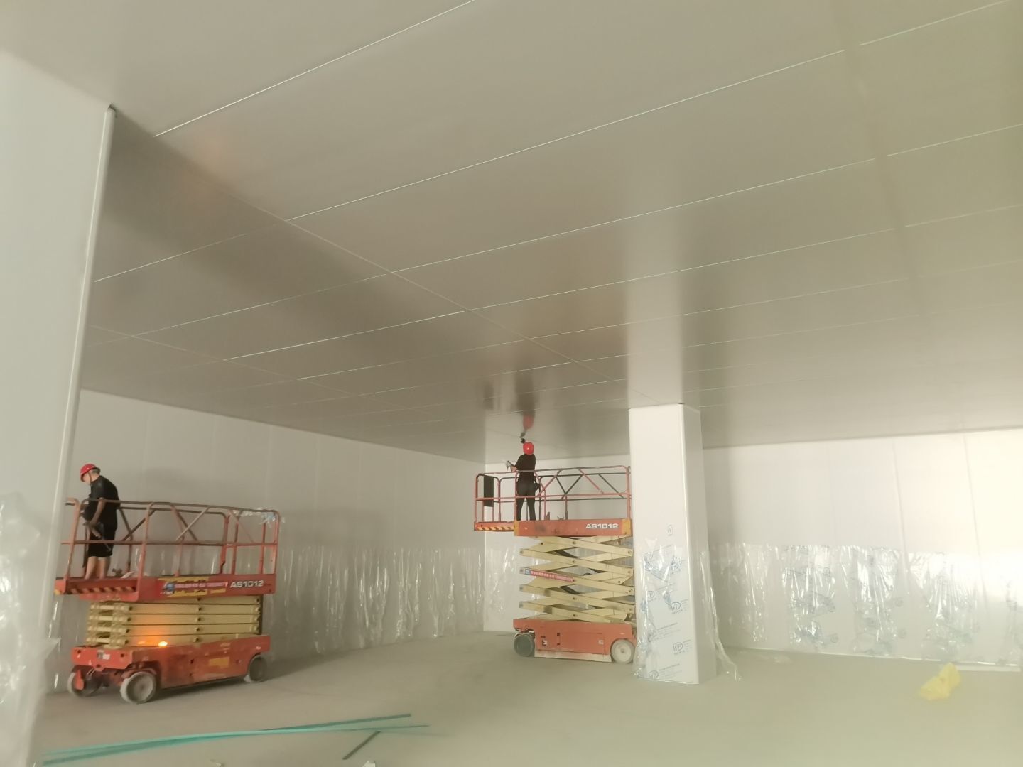 1、擋水墻貼磚完成95%(剩余吊裝口完成后實施); 2、凍庫庫板安裝完成100%,頂板完成100%; 3、低溫庫加熱絲安裝完成100%,保護層完成100%,擠塑板完成100%,凍庫地面混凝土澆筑完成100%,切縫完成,養護; 3、彩鋼板安裝完成85%; 4、頂板安裝完成85%; 5、實驗室墻板頂板完成100%; 6、化驗室墻板頂板完成100%; 7、工具間墻板完成100%。