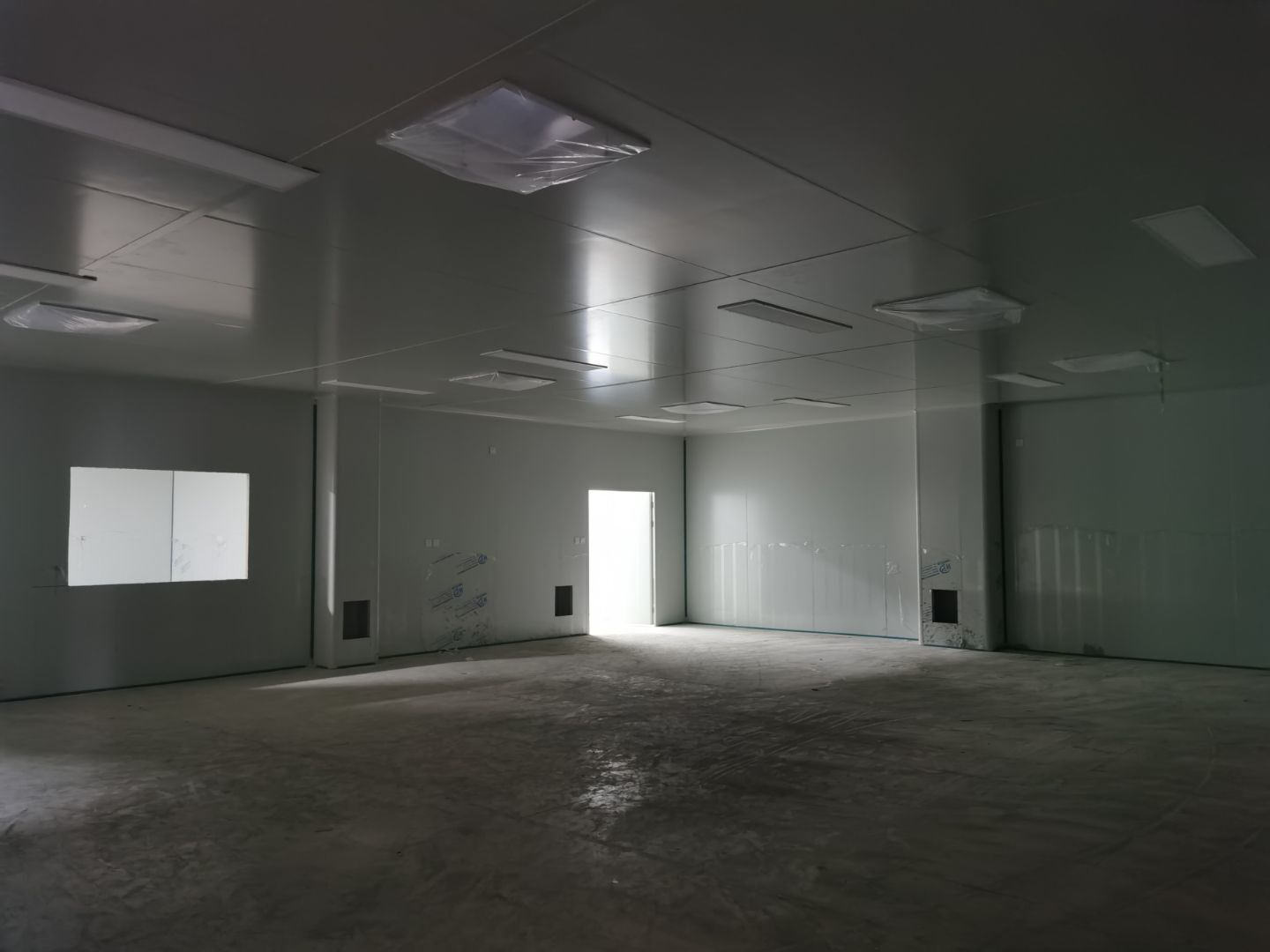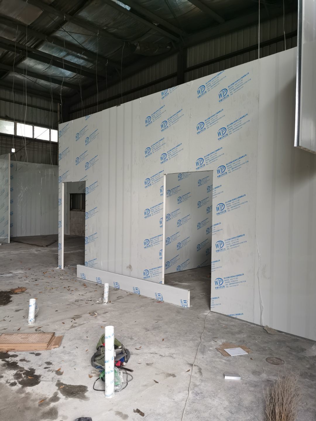 1,彩鋼墻板立板除預留設備外完成100% 2,彩鋼板吊頂除預留外,完成95% 3,三防板吊頂完成100% 4,水電安裝完成60% 5,彩鋼板收尾工作完成30%