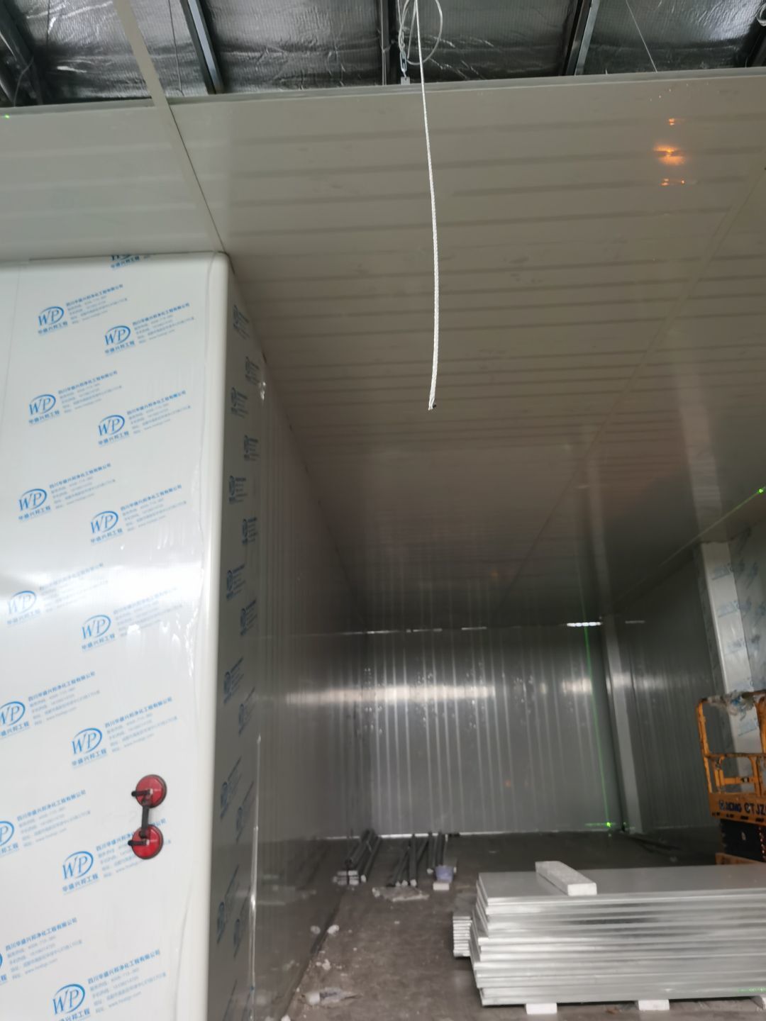 1,彩鋼墻板立板除預留設備外完成100% 2,彩鋼板吊頂除預留外,完成95% 3,三防板吊頂完成100% 4,水電安裝完成60% 5,彩鋼板收尾工作完成50%