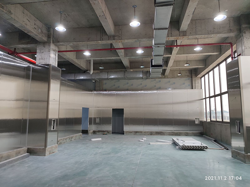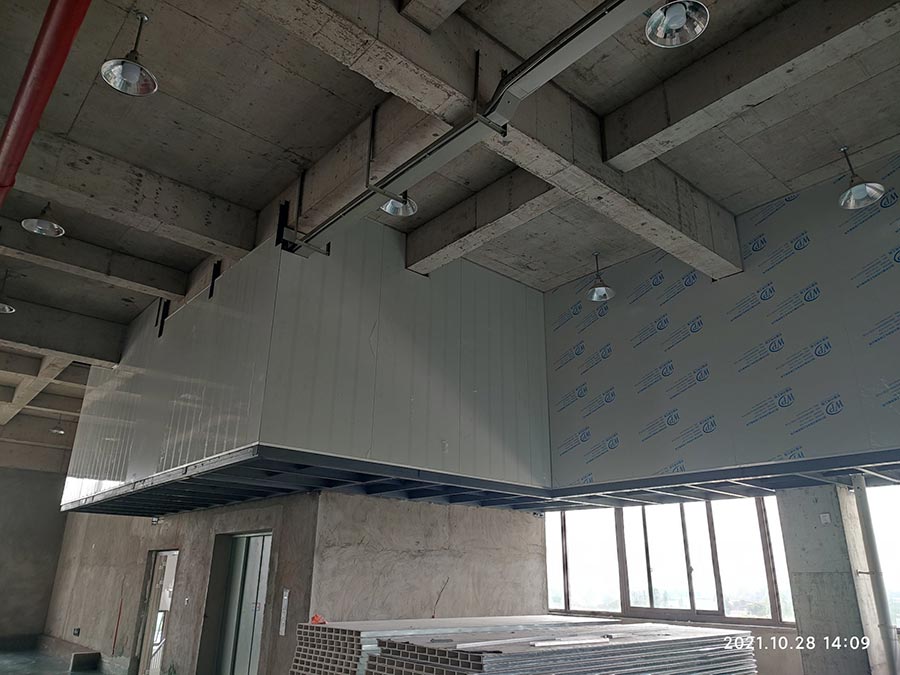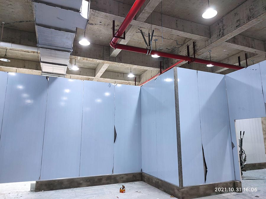 工程進度: 1,一樓鋼平臺彩鋼隔墻完成50% 2,二樓更衣區過道頂板完成 3,3樓頂板吊桿安裝完成80% 4,電工進場,點位繪制并跟甲方確認完成3,4樓
