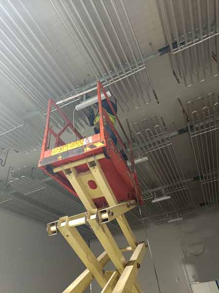 1、裝修水電安裝施工作業 2、蒸發冷設備機組管道焊接作業。 3、制冷管道保溫 4、圓弧施作業.鋼制門安裝 5、管道保溫作業。 6、無縫鋼管陪管 7、設備機組配線。 8、觀察窗安裝完成 9、凍庫控制電柜安裝。 10、平臺設備動力電施工 11、速凍庫2鋁格柵施工作業 12、新風系統安裝完成95%) 13、衛生打掃